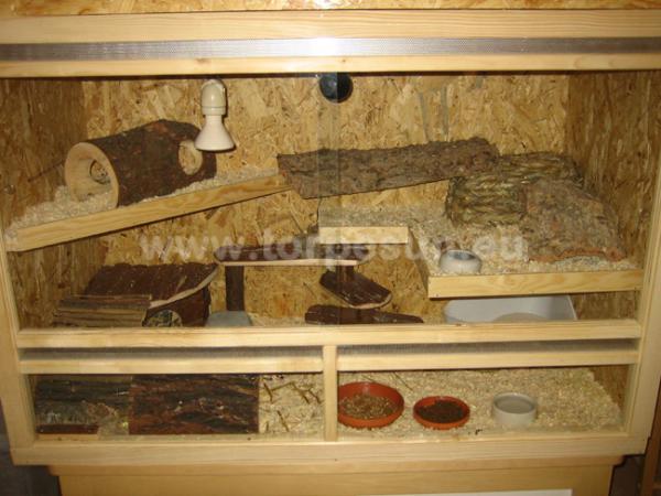 Megfelelő méretű üvegterrárium kisállat-boltban beszerezhető, vagy méretre készíttethető. Az üvegterrárium oldala legalább kb. 35 cm magas legyen. Ennél viszont ne készíttessünk jóval magasabb oldalfalú zárt férőhelyet, mert a szellőzés problematikus lesz. A vizeletből párolgó gázok megrekednek a terrárium alsó rétegeiben, éppen ott, ahol állataink tartózkodnak.