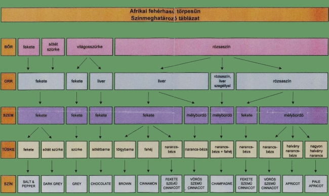 A lenti képen lévő csodaszép chocolate white törpesünin jól megfigyelhető a sötét orr, sötét szem, maszkos arc, színes bőr, míg a tüskéi majdnem fehérek.